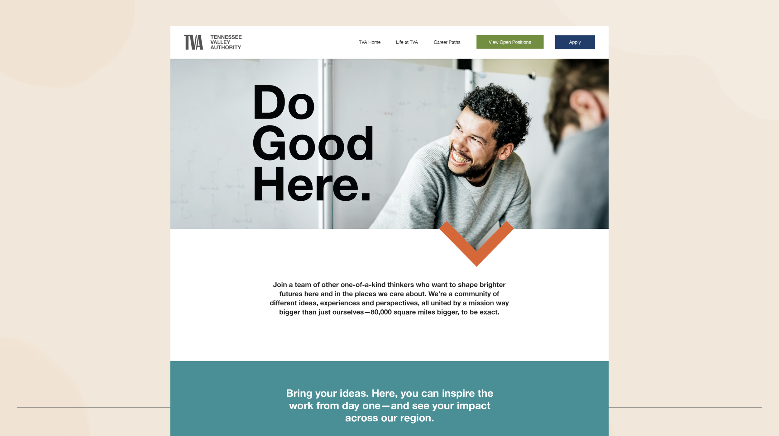 What do area college students know about the Tennessee Valley Authority? They generate power and they manage dams in the region. And that maybe they hire linemen to maintain power lines. This campaign was designed to put TVA on their radar as a promising place to not just gain career experience, but find meaning at work—with hundreds of internships opportunities to choose from.